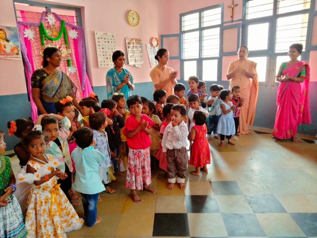 Creche: The poor people, around 30-40 families, leave their babies between the ages of 2-4 years from 9 am to 2:30 pm. They are provided with nourishing food, snacks, taught rhymes, alphabets, and play, and are allowed to take rest. At 2:30 pm, their mothers come and take them home.
